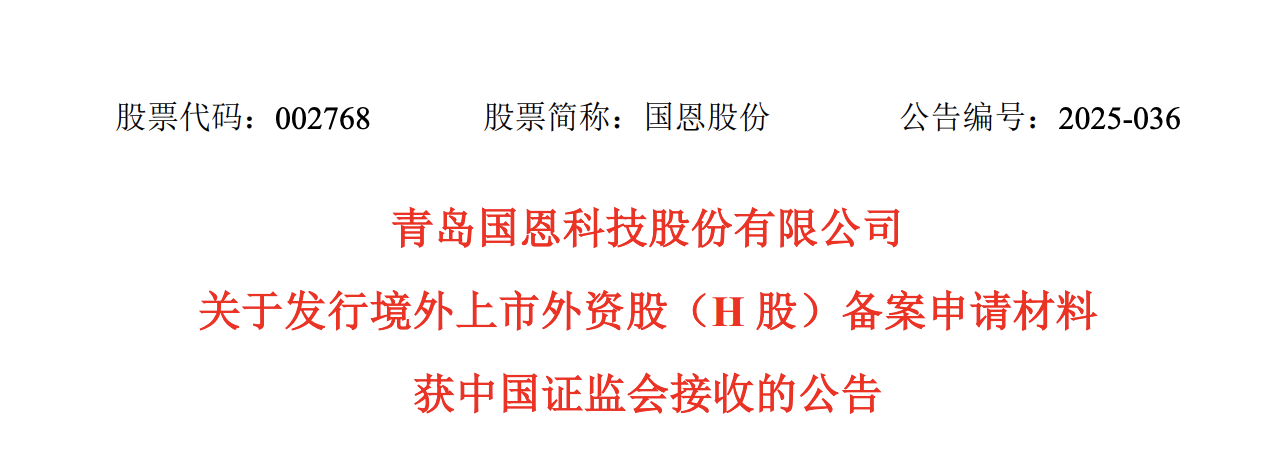 公告显示,国恩股份已于 2025 年 6 月 26 日向香港联合交易所有限公司递交了发行境外上市外资股(H 股)并在香港联交所主板挂牌上市的申请。