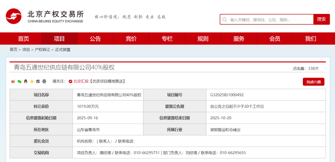 [size=0.8]9月16日,招商局国际码头(青岛)有限公司(以下简称“招商局青岛”)在北京产权交易所挂牌转让青岛五通世纪供应链有限公司(以下简称“青岛五通”)40%股权,转让底价为1019万元。
