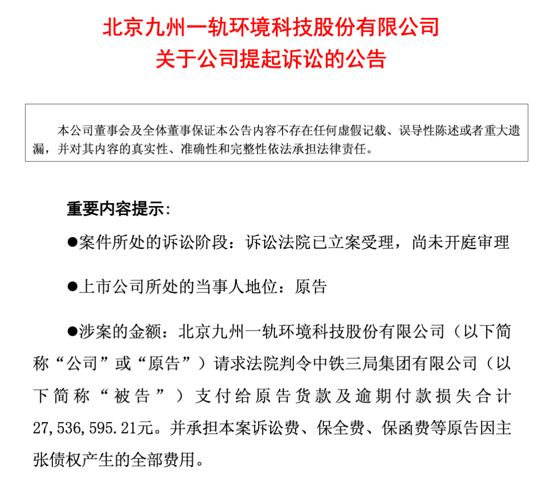 [size=0.8]9月22日晚间,九州一轨(688485.SH)披露,9月19日,公司向北京市房山区人民法院提起诉讼,追讨其认为中铁三局拖欠的货款及逾期付款损失,总金额高达2753.66万元。
