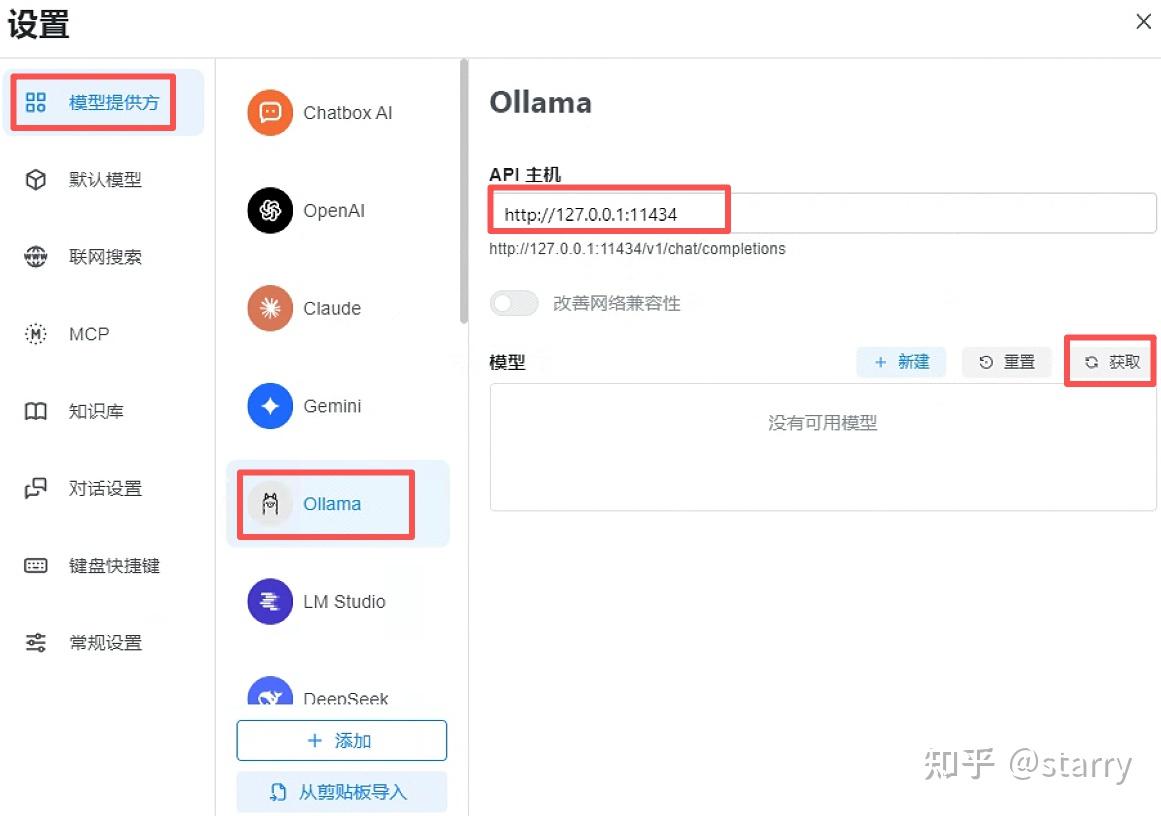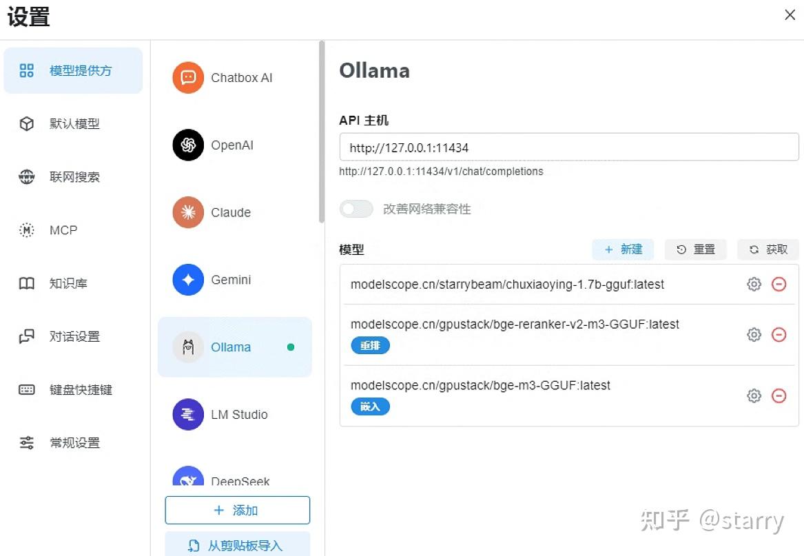 选择ollama,配置API主机为“http://127.0.0.1:11434”,点击“获取”按钮,可以查看当前已经下载的模型清单