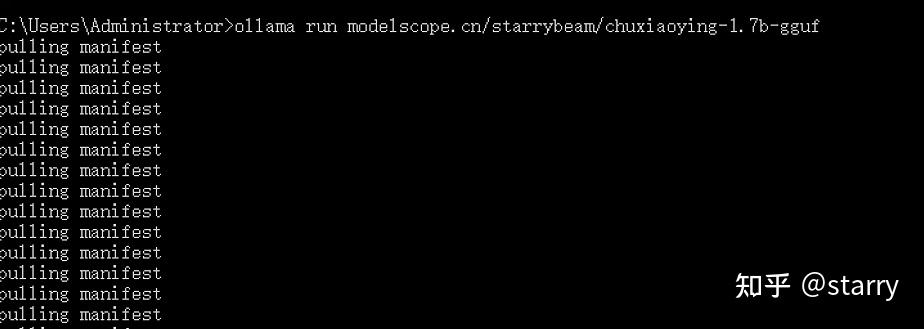 打开终端或 CMD 命令窗口,输入对应的运行指令:ollama pull http://modelscope.cn/starrybeam/chuxiaoying-1.7b-gguf ,下载大模型。