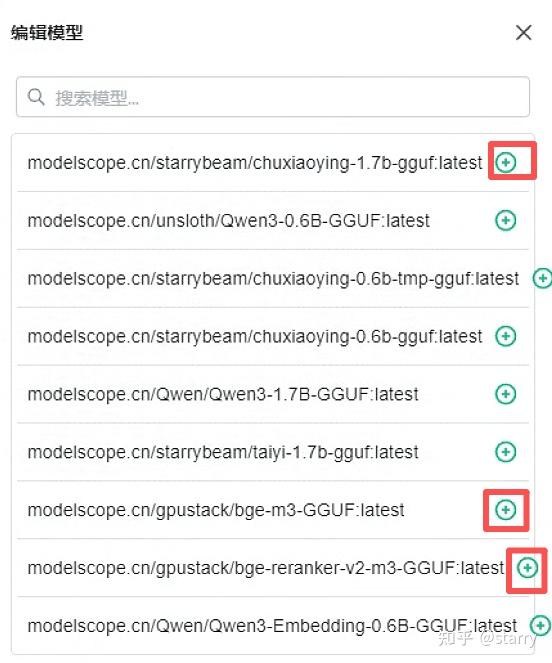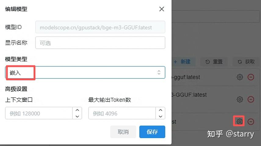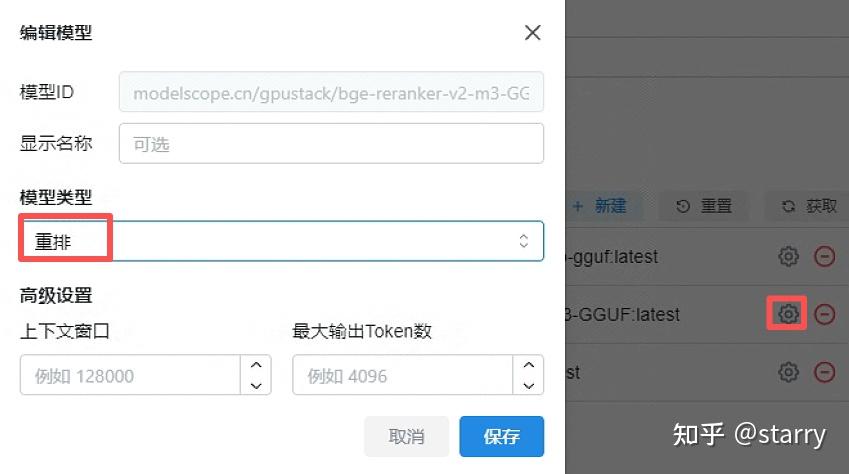 http://modelscope.cn/gpustack/bge-reranker-v2-m3-GGUF模型的模型类型需要修改为“重排”,http://modelscope.cn/gpustack/bge-m3-GGUF模型的模型类型需要修改为“嵌入”。修改完毕后效果如下图