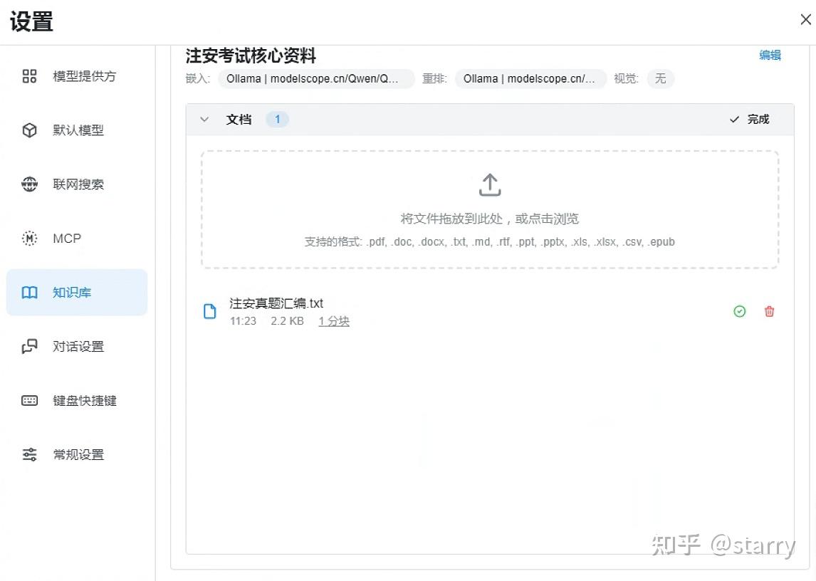 创建知识库:点击“设置” -> “知识库” -> “添加”,创建一个名为“注安考试核心资料”的知识库。