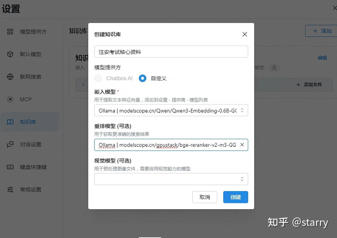 关联专业模型:在创建时,正确选择我们之前下载并配置好的“嵌入模型”和“重排模型”