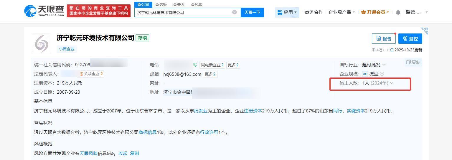 [size=0.8]天眼查平台显示,济宁乾元环境技术有限公司成立于2007年,2024年年报显示,公司参保人数为1。