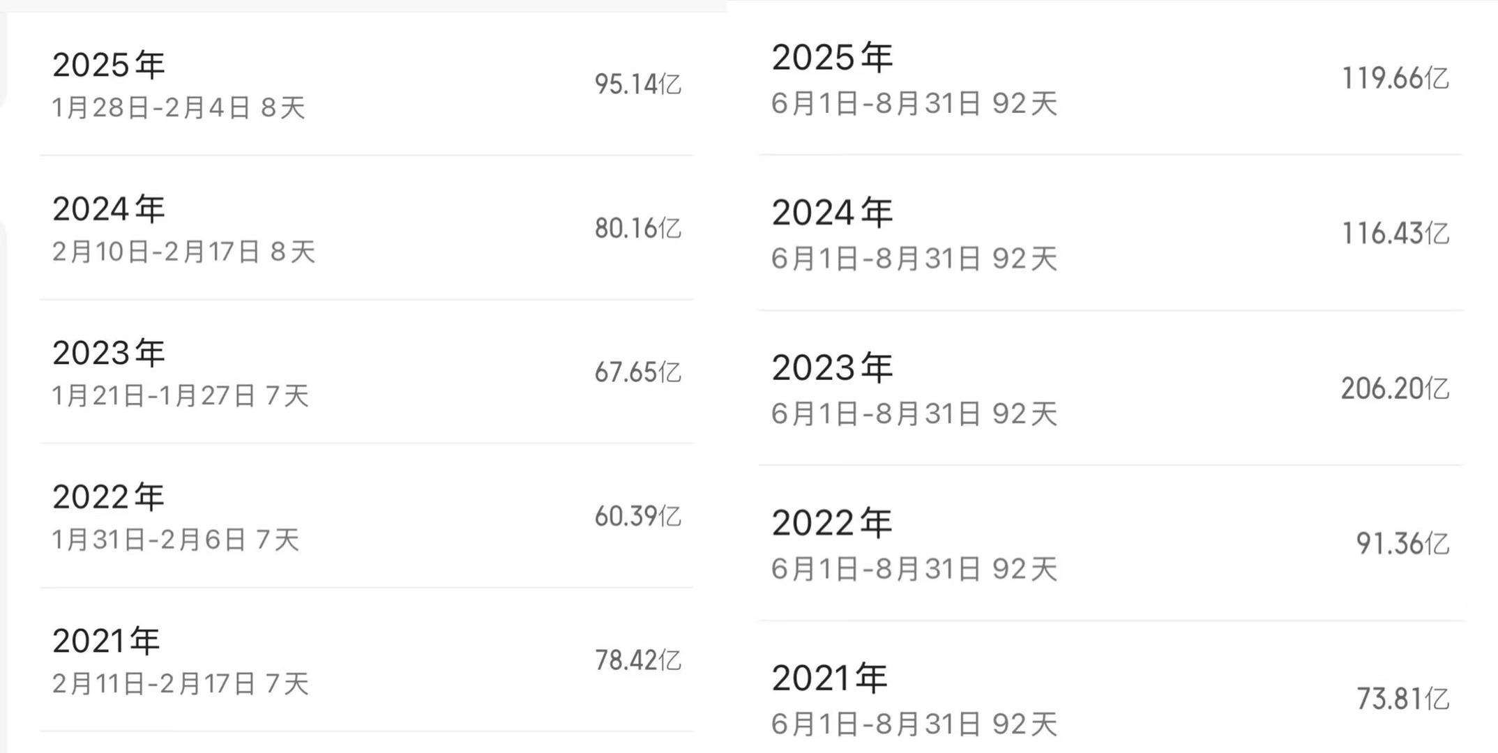 [size=0.8]近五年春节档(左)、暑期档(右)票房数据,图据猫眼专业版