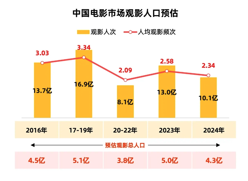 [size=0.8]从2023年到2024年,中国观影总人口数从5亿降至4.3亿,人均观影频次从2.6部降至2.3部。2024年大盘的八成票房来自放映当日的临场购票,预售票房下降了80%。