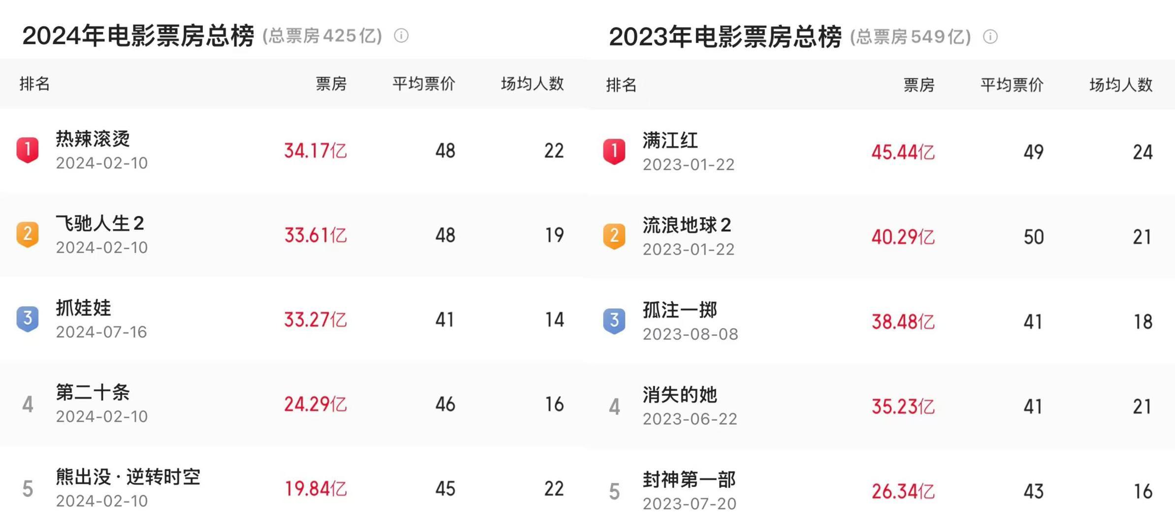 [size=0.8]2024、2023年年度票房前五,图据猫眼专业版