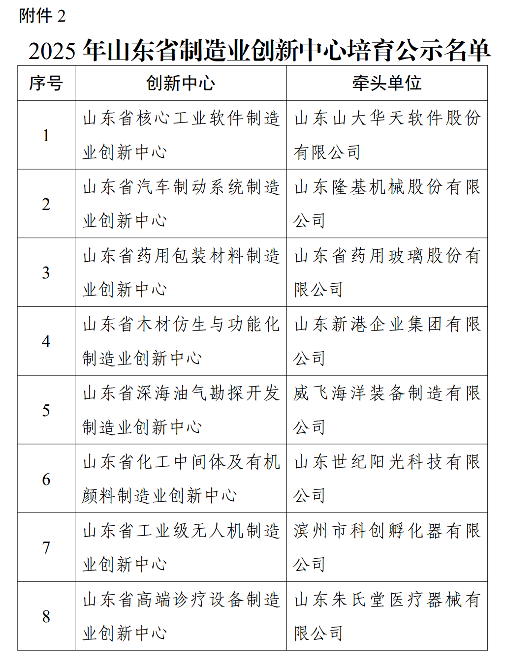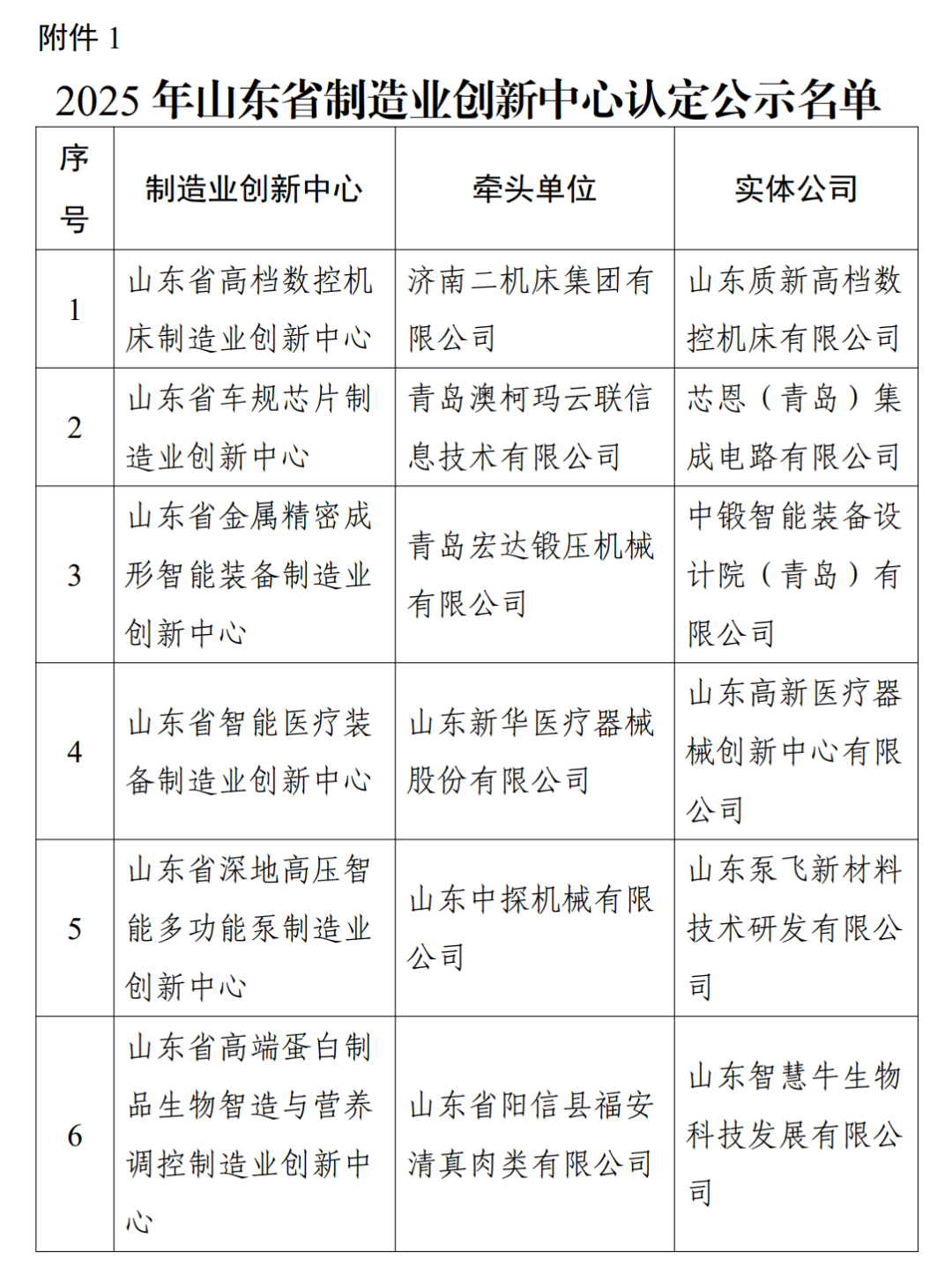 根据《山东省制造业创新中心建设工作指南》(鲁工信技〔2023〕150号)和《关于组织开展2025年山东省制造业创新中心培育和认定工作的通知》要求,省工业和信息化厅组织开展了山东省制造业创新中心认定和培育工作。经企业申报、各市初审推荐、专家答辩和现场核查等程序,拟将济南二机床集团有限公司牵头建设的山东省高档数控机床制造业创新中心等6家中心认定为山东省制造业创新中心,将山东山大华天软件股份有限公司牵头组建的山东省核心工业软件制造业创新中心等8家中心列为山东省制造业创新中心培育对象。现将认定名单和培育名单(见附件)予以公示。