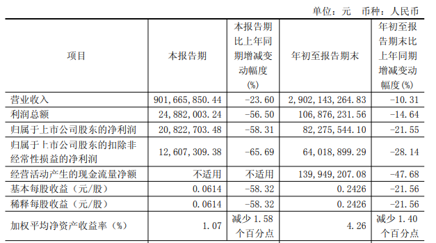 [size=0.8]但进入2025年三季度,公司业绩出现明显下滑。前三季度财务数据显示,公司实现营业总收入29.02亿元,同比下降10.31%;归母净利润8227.55万元,同比下降21.55%。