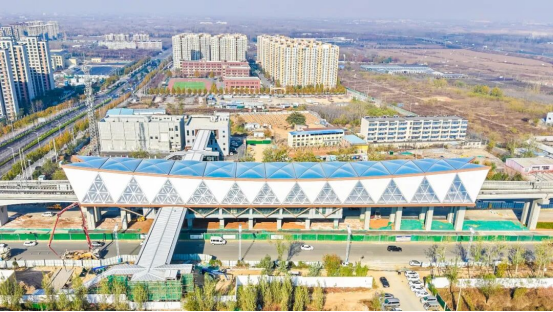 [size=0.8]汉峪金谷站位于经十路与凤凰路交叉口西南侧,沿经十路呈“一字型”布置。此站立足商务区属性,通过模块化构件与渐变色彩的运用,艺术化表达“金谷·腾飞”的意象,既呼应区域金融中心的现代气质,也隐喻地铁带来的发展机遇,让乘客在穿行中感受到城市进阶的脉搏。