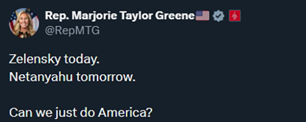 [size=0.8]当地时间12月28日,格林在社交媒体平台X上写道:“今日(见乌克兰总统)泽连斯基,明日(见以色列总理)内塔尼亚胡。我们能不能优先考虑美国本国的事”?