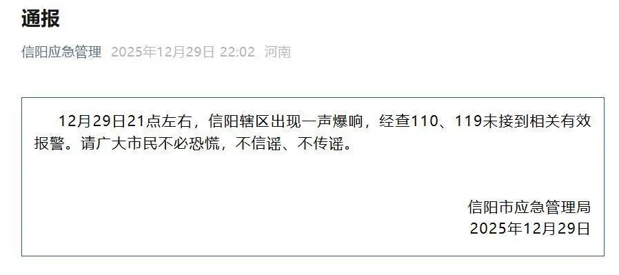 据信阳市应急管理局发布官方通报:12月29日21时左右,信阳辖区出现一声爆响,经查110、119未接到相关有效报警。请广大市民不必恐慌,不信谣、不传谣。