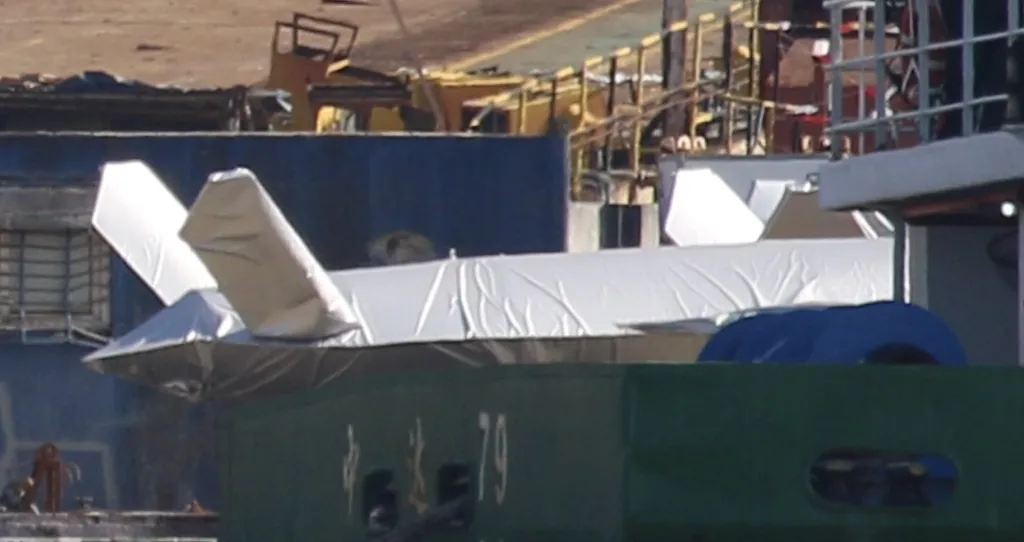 [size=0.8]最初的照片只有这种无人机的后部照片,新的图像则展示了无人机的全貌。这架无人机被防水布覆盖,位于“集装箱武库船”的后方。其他照片则证实至少一架隐身制空无人机登上076型两栖攻击舰的甲板。