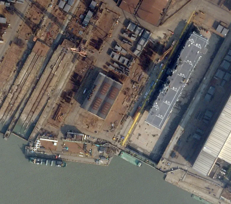 [size=0.6]社交媒体上流传的,位于沪东中华船厂的无人僚机(上图);卫星图显示076型的附近有数架无人僚机社交媒体