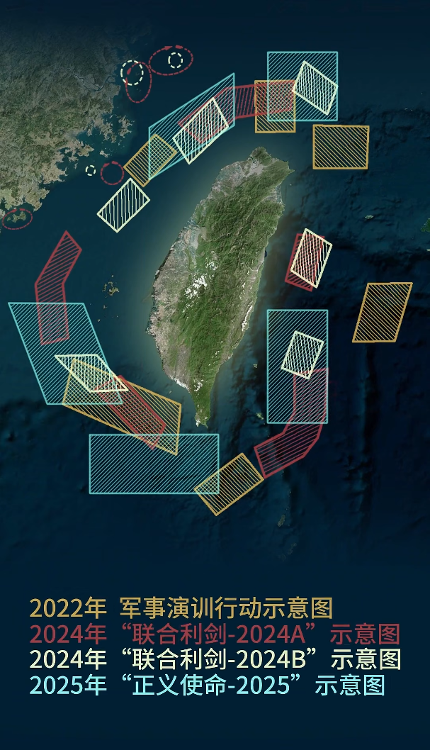 [size=0.8]东部战区新闻发言人施毅陆军大校表示,12月29日开始,中国人民解放军东部战区组织陆军、海军、空军、火箭军等兵力,位台湾海峡、台岛北部、台岛西南、台岛东南、台岛以东,组织“正义使命-2025”演习,重点演练海空战备警巡、夺取综合制权、要港要域封控、外线立体慑阻等科目,舰机多向抵近台岛,诸军兵种联合突击,旨在检验战区部队联合作战实战能力。