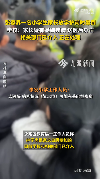 [size=0.8]12月29日下午,在张家界永定区一所小学门口,一位家长在站护学岗时突然晕倒,送医后身亡。30日,事发小学工作人员告诉九派新闻记者,出事的家长今年45岁,据监控视频显示,该家长在护学岗大概站了20多分钟,期间还与其他家长聊天、抽烟,倒地后,学校第一时间将其送医,经检查显示其有基础疾病。