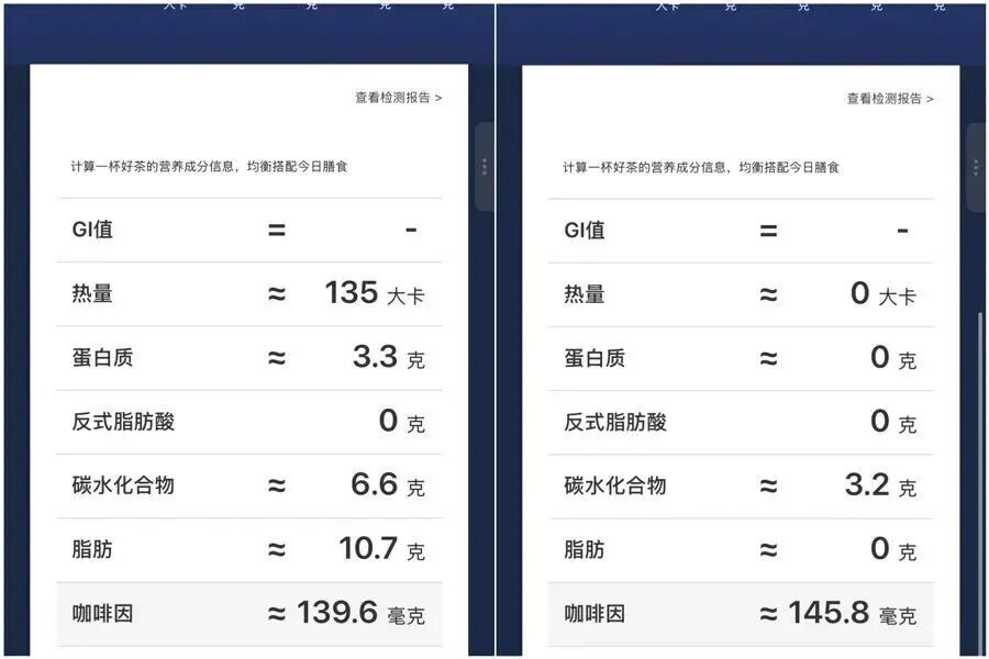 [size=0.6]某茶饮品牌部分茶饮产品中的咖啡因含量(左图为一款原叶奶茶,右图为一款原叶果茶)