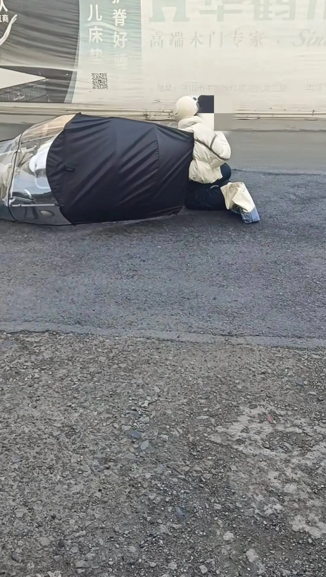 路面洒水后结冰致骑行路人摔倒。 网络视频截图