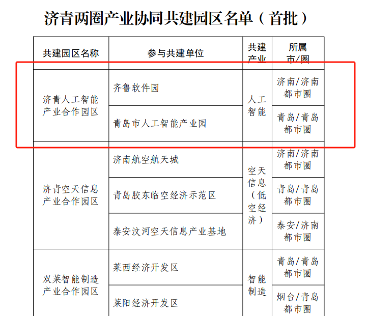 近日,山东省发展和改革委员会公布首批济青两圈产业协同共建园区,由青岛市人工智能产业园与齐鲁软件园协同共建的济青人工智能产业合作园区成功入选。两大园区将在产业集群打造、公共平台共建、项目联合招引等方面展开深入合作,打造全省人工智能产业的核心集聚区。