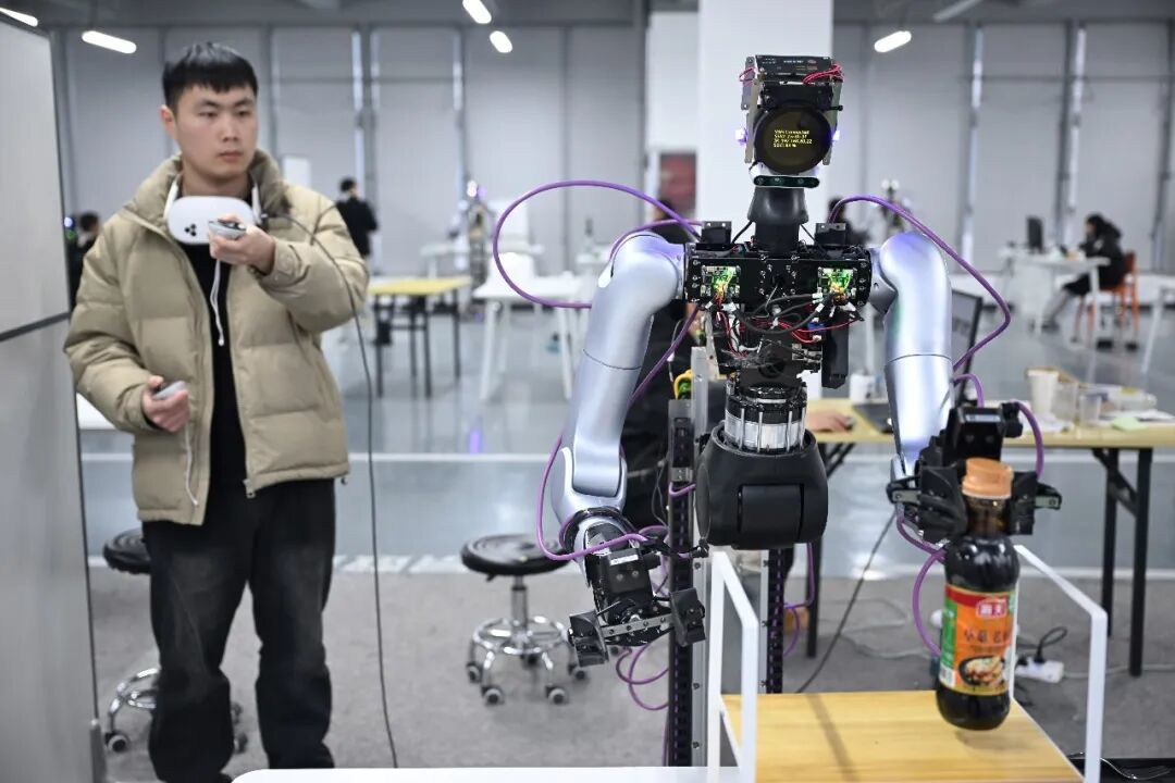 [size=0.6]安徽省合肥市零次方机器人数据采集中心内,机器人训练师正在训练机器人以采集数据。张大岗摄