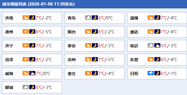 最低气温:德州、鲁中山区和半岛内陆地区-5℃左右,沿海地区-1℃左右,其他地区-3℃左右。