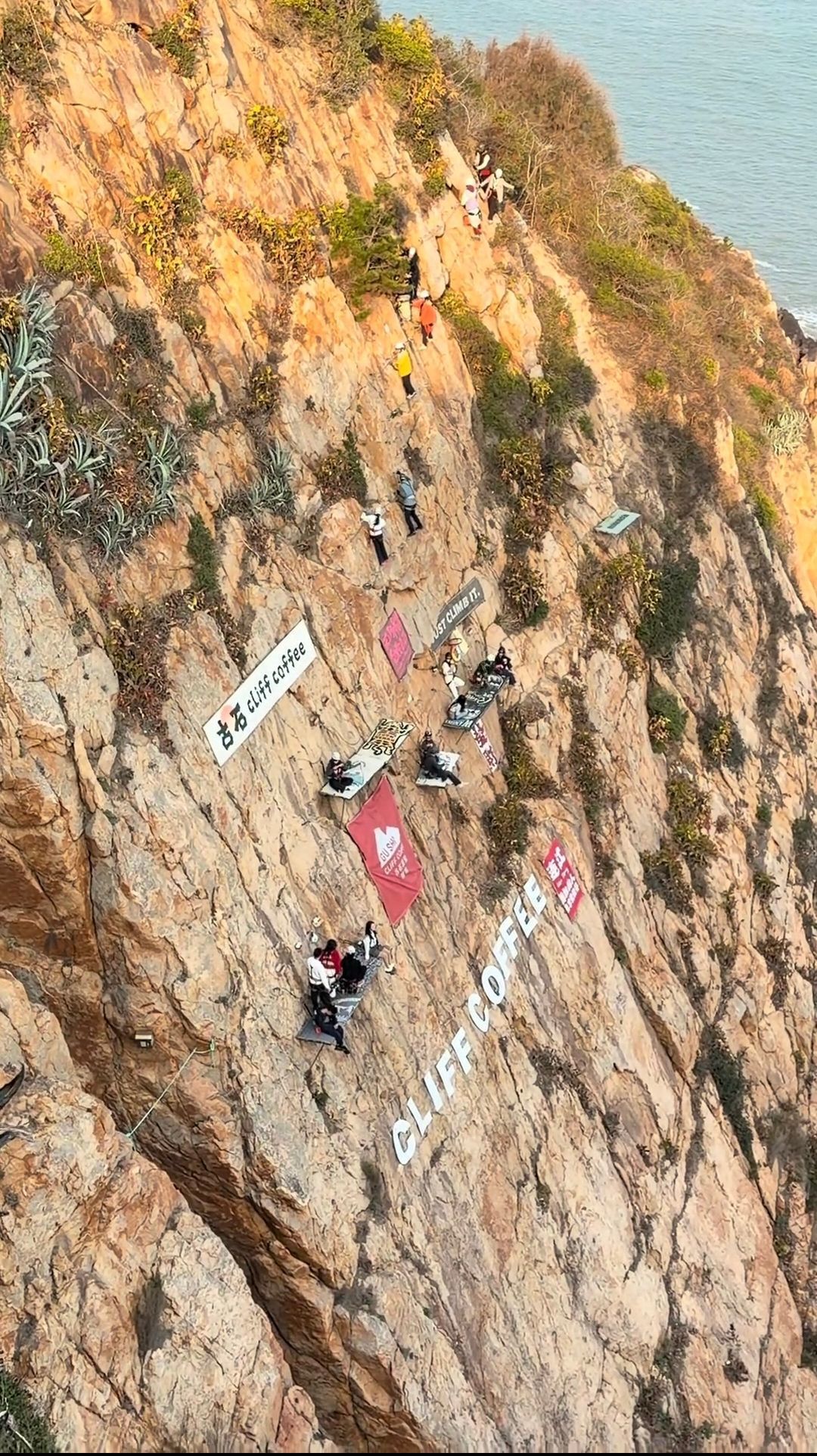 [size=0.8]多位网友晒出的视频显示,在一处陡峭的崖壁上,不少顾客身上系着安全带,坐在几乎垂直于崖壁的“座位”上,周边的崖壁上还挂有“古石咖啡”字样的横幅,脚下就是大海。还有系着安全带的顾客,正小心翼翼踩着崖壁上的“脚踏板”,向“座位”处前进。