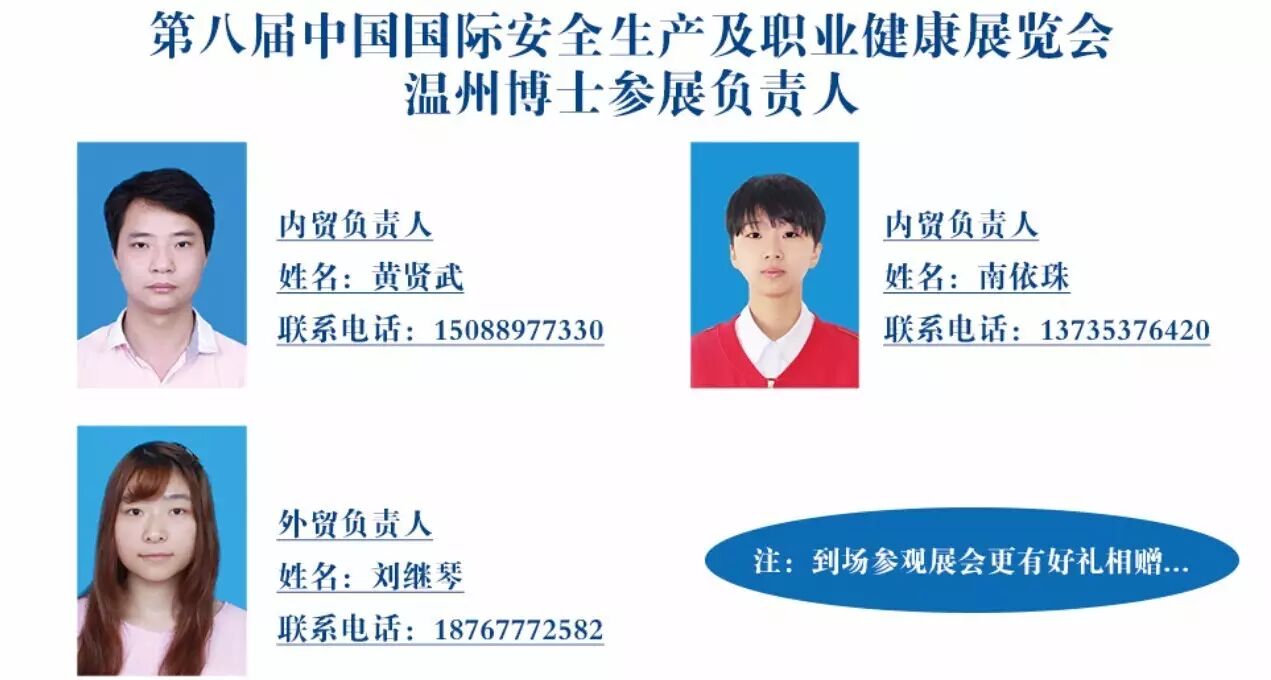 博士安全 9.27~9.29 应第八届中国国际安全生产及职业健康展览会邀请,我司(温州博士安全用品有限公司)将于2016年9月27日至9月29日,北京市朝阳区北辰路奥林匹克公园国家会议中心参展,为期3天,展位号:C404 我司参展负责人:黄贤武,南依珠,刘继琴将为您服务!